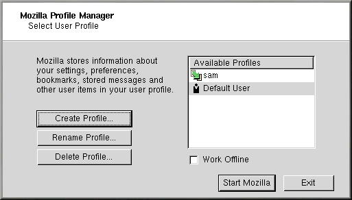 To add new profiles or delete existing profiles later on, you will need to run the Mozilla Profile Manager again. To launch the Mozilla Profile Manager, at the shell prompt type the following command:
