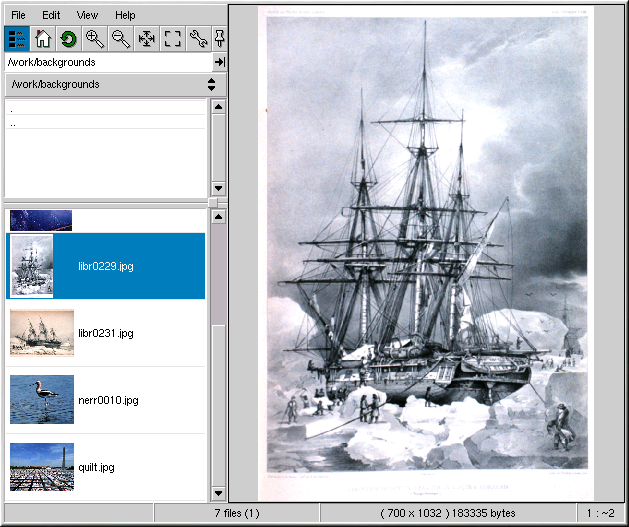 The interface of GQview is simple and straightforward. The toolbar allows you to fit the image to the display window, zoom in and out and toggle between thumbnail view and text-only browser panels. It also has a text field for you to enter a particular path to your image directories. Right-clicking on an image in the display area opens a pop-up menu of image size and other file options such as renaming, moving, copying. You can also hide and unhide the thumbnail file panel and toggle windowed and fullscreen modes within the pop-up menu.