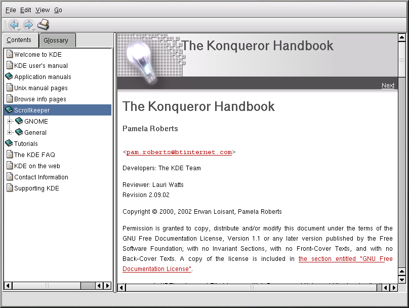For additional information on using Konqueror, click on Help (on the top menu panel) and then on Konqueror Handbook.