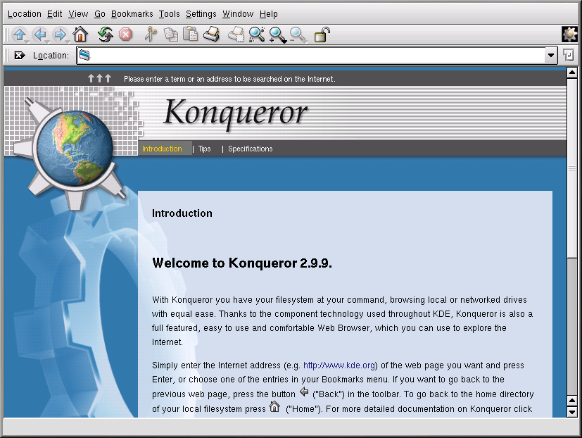 When you first launch Konqueror, you will be presented with an Introduction screen. This screen offers basic instructions for browsing a webpage or your local file system.