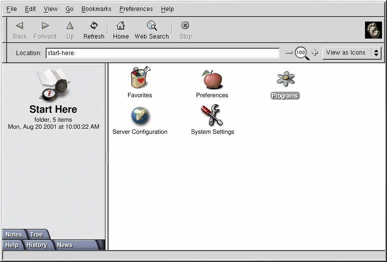 The Start Here page in Nautilus contains additional configuration tools that help you with your new Red Hat Linux system and the server applications included.