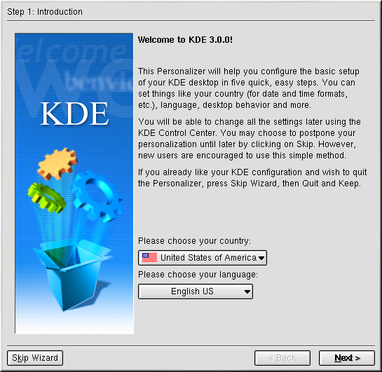 The first time you log into KDE (refer to Chapter 1 for more information about logging into your Red Hat Linux machine), a setup wizard will appear that allows you to set some initial preferences prior to using the desktop. This wizard guides you through setting up your language and locale settings, choosing how to interact with the KDE interface, configuring your desktop visual effects, and even customizing the look of your desktop. Figure 3-1 shows the welcome screen of the KDE setup wizard. You can elect to skip the setup wizard and run with KDE defaults by clicking Skip Wizard.