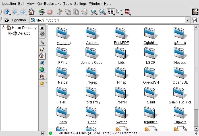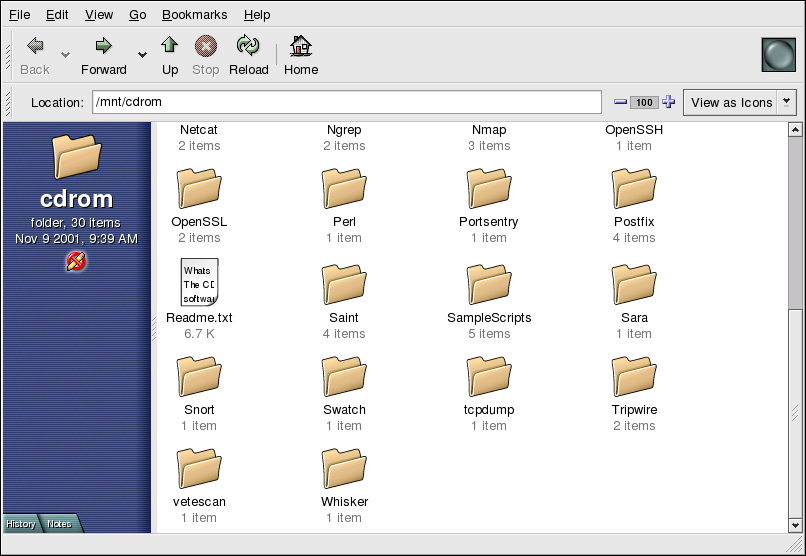 By default, CDs are automatically mounted and opens the default file manager for you to explore the contents of the CD. Figure 3-5 shows the contents of a CD-ROM within the Nautilus file manager.
