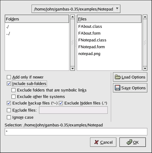 If you need to free some hard drive space, or send multiple files or a directory of files to another user over email, File Roller allows you to create archives of your files and directories. To create a new archive, click New on the toolbar. A file browser will pop up, allowing you to specify an archive name and the compression technique (you can usually leave this set as Automatic and simply type in the file archive name and file name extension in the provided text box). Click OK and your new archive is now ready to be filled with files and directories. To add files to your new archive, click Add, which will pop up a browser window (Figure 12-2) that you can navigate to find the file or directory you want to be in the archive. Click OK when you are finished, and Close to close the archive.