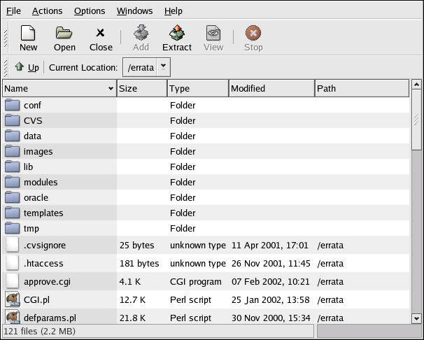 To unarchive and/or decompress a file, click the Open toolbar button. A file menu will pop up, allowing you to choose the archive you wish to work with. For example, if you have a file called foo.tar.gz located in your home directory, highlight the file and click OK. The file will appear in the main File Roller browser window as a folder, which you can navigate by double-clicking the folder icon. File Roller preserves all directory and subdirectory hierarchies, which is convenient if you are looking for a particular file in the archive. You can extract individual files or entire archives by clicking the Extract button, choosing the directory you would like to save the unarchived files, and clicking OK.