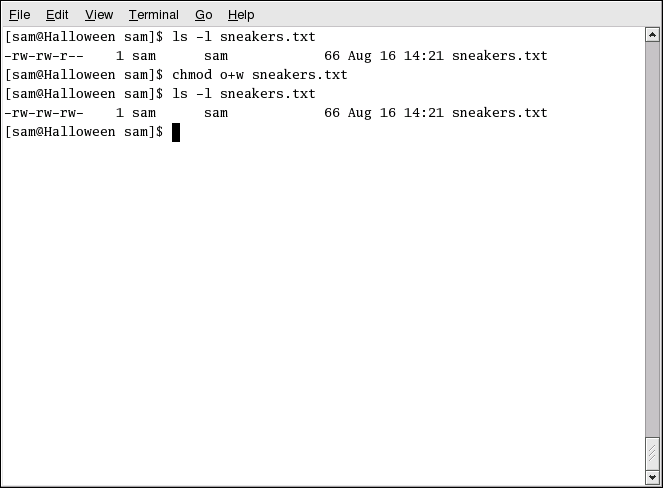 The o+w command tells the system you want to give others write permission to the file sneakers.txt. To check the results, list the file's details again. Now, the file looks like this: