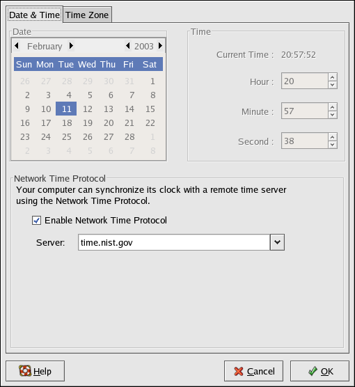 The Time and Date Properties Tool allows the user to change the system date and time, to configure the time zone used by the system, and to setup the Network Time Protocol (NTP) daemon to synchronize the system clock with a time server.
