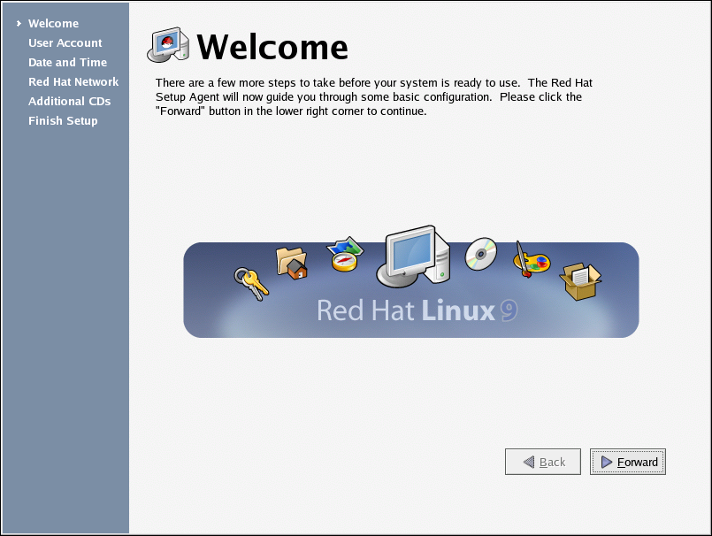 The first time you start your Red Hat Linux system, the Setup Agent is presented. The Setup Agent guides you through the configuration of your Red Hat Linux system. Using this tool, you can set your system time and date, add users to your system, install software, register your machine with the Red Hat Network, and more. Setup Agent allows you to configure your environment at the beginning, so that you can get started using your Red Hat Linux system quickly.