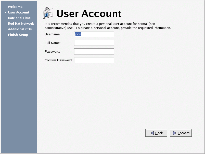 The Setup Agent first prompts you to create a user account that you should use on a routine basis. It is not recommended to log in to your root account for common computing tasks, as you may damage your system or unintentionally delete a file. The Setup Agent lets you enter a username, an optional full name for the account, and a password (which you must enter twice). This creates a user account that you can use to log into your Red Hat Linux system and which has its own home directory on the system to store files.