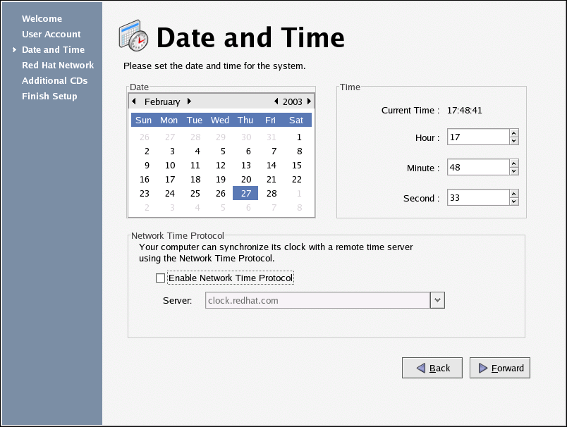 You may also synchronize your date and time automatically with a network time server — a computer that sends accurate date and time settings to your system through a network connection. Check the box labeled Enable Network Time Protocol and use the drop-down menu to select the time server you want to use. Once you have set your time and date, click Forward to continue.