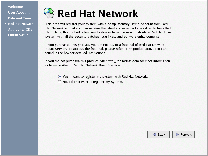 To register your system with Red Hat Network and receive automatic updates of your Red Hat Linux system, choose Yes, I would like to register my system with Red Hat Network. This will start the Red Hat Update Agent — a utility that guides you step-by-step through the registration of your machine with Red Hat Network. Selecting No, I do not want to register my system skips the registration. For more information about Red Hat Network and registering your machine, refer to the Red Hat Network documentation at http://www.redhat.com/docs/manuals/RHNetwork/.