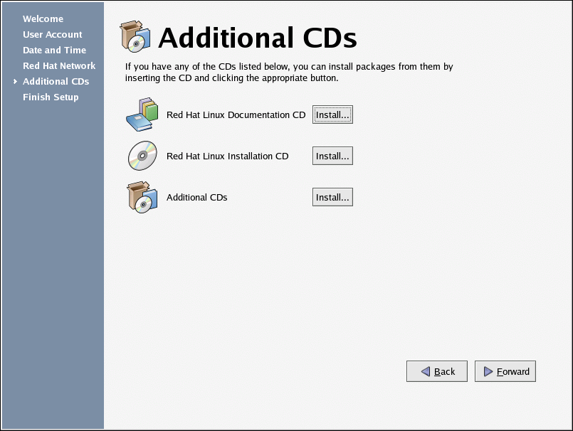 To install Red Hat Linux RPM packages that you did not install during installation, software from third-party providers, or documentation from the Red Hat Linux Documentation CD, you can do so at the Additional CDs screen. Insert the CD containing the software or documentation you want to install, click the Install... button, and follow the instructions.