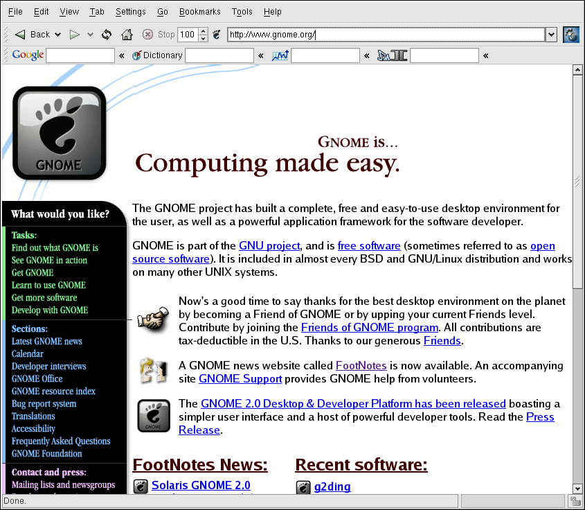 Galeon is a Web browser that is based on Mozilla. It is only a Web browser and does not feature email, newsgroups, or anything other than Web browsing and searching. This can be useful if you want to browse the Web without the need to email or chat with others. Galeon also has some extra features that are not included in Mozilla.