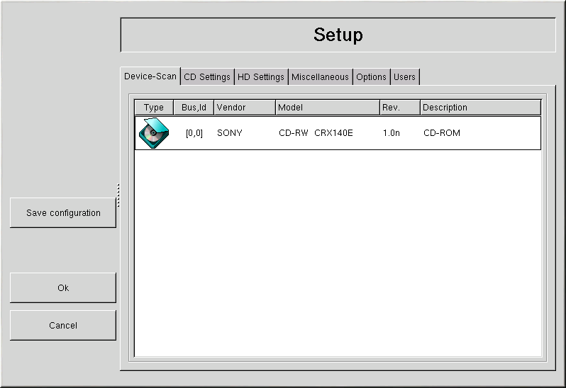 To start X-CD-Roast choose Main Menu => System Tools => CD Writer. To start it at a shell prompt, type /usr/bin/xcdroast. X-CD-Roast first scans your device busses and find your CD-R(W) drive. It then allows you to configure settings for CD-writer, CD-ROM drive, and more. Figure 4-8 illustrates the Setup screen and its configuration options. Note that your CD-R(W) drive brand may be different from the drive shown.