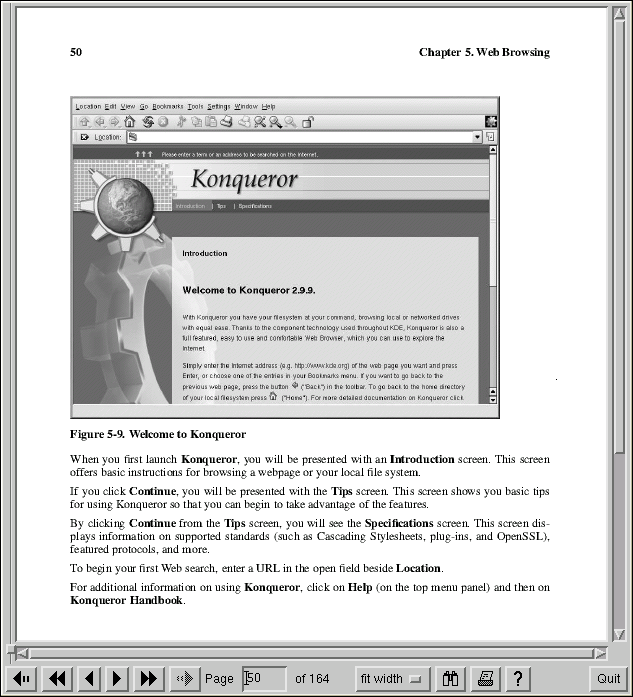 An open source application called xpdf is included with Red Hat Linux. The xpdf toolbar at the bottom has navigational tools that let you move backward and forward through the PDF document, as well as standard zoom, print, and find tools. The xpdf man page provides useful information on the xpdf options. To view the xpdf man page, at a shell prompt type man xpdf.