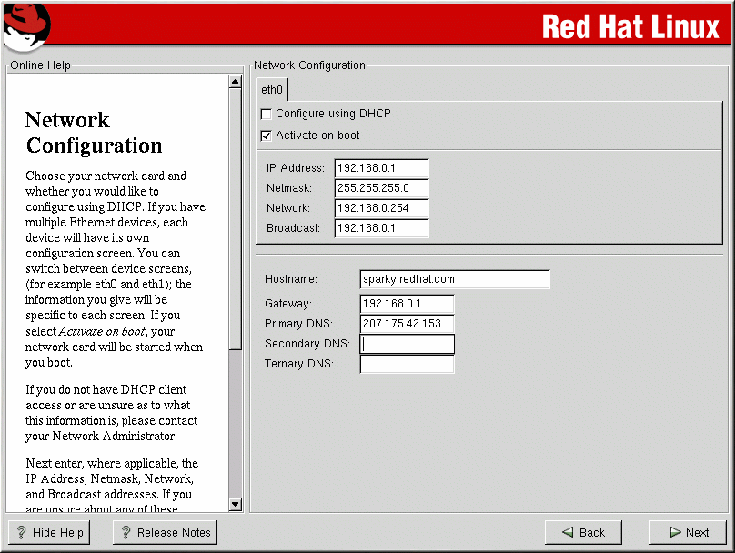 If you do not have a network card, you will not see this screen. Please skip ahead to the next section, the section called Time Zone Configuration.