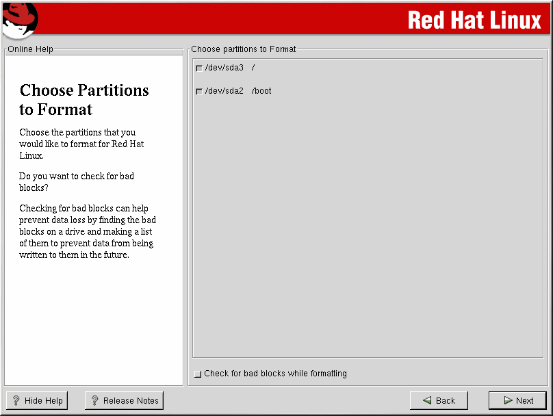 Selecting Check for bad blocks while formatting may dramatically increase your total installation time. Since most newer hard drives are quite large in size, checking for bad blocks may take a long time; the length of time depends on the size of your hard drive. If you choose to check for bad blocks, you can monitor your progress on virtual console #6. |