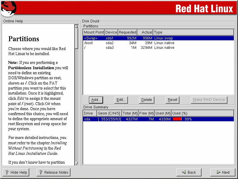 The partitioning tool used in Red Hat Linux 7.1 is Disk Druid. With the exception of certain esoteric situations, Disk Druid can handle the partitioning requirements for a typical Red Hat Linux installation.