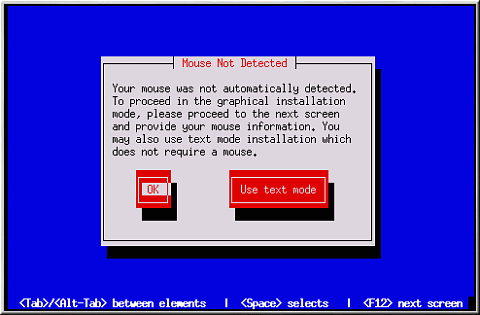 You can choose to continue with the GUI installation or use the text mode installation, which does not require using a mouse. If you choose to continue with the GUI installation, you will need to provide the installation program with your mouse configuration information (see Figure 4-3).