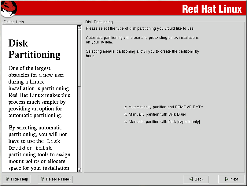 If the Automatic Partitioning option does not appear, then you do not have enough free space available for this installation option. You can either exit out of the installation program and make space available, or you can partition manually. |