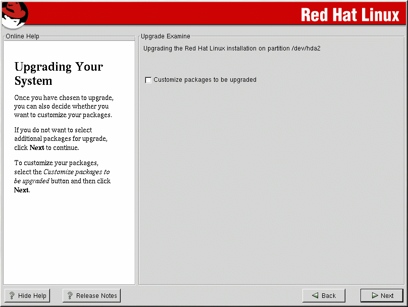 To let the installation program begin the upgrade process for you, make sure Customize packages to be upgraded is not selected and click Next (see the section called Upgrading Packages).