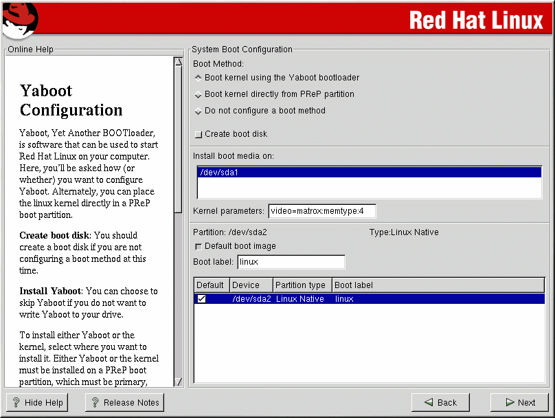 If you do not wish to use YABOOT, you can also place the kernel directly in a PReP boot partition and boot your Red Hat Linux system from the Open Firmware command line. If you use this method, be sure to include a root= argument at the boot command, eg: boot sd: root/dev/sda2 (if sda2 is your root ("/") partition.