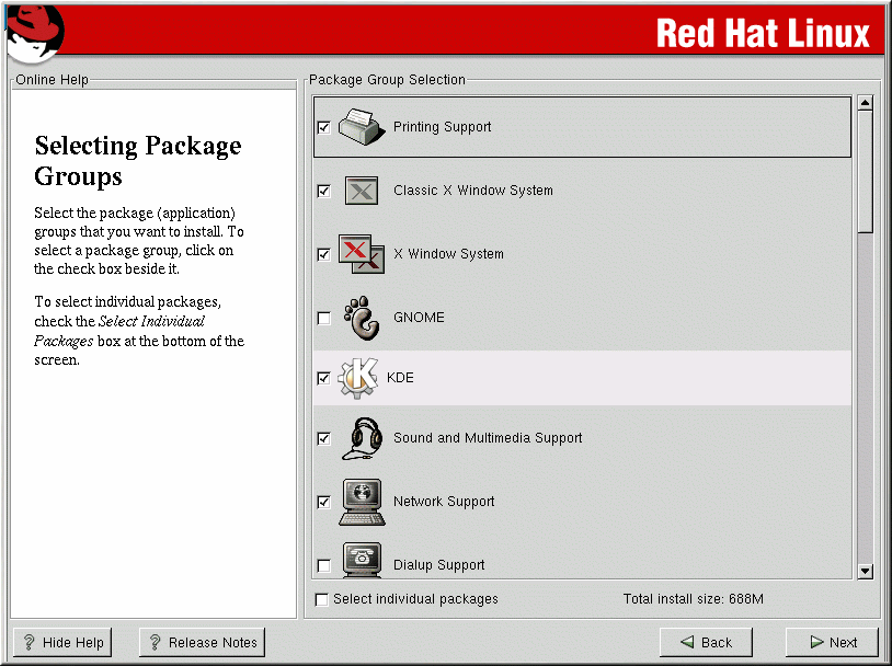 Some packages (such as the kernel and certain libraries) are required for every Red Hat Linux system and are not available to select or deselect. These base packages are selected by default. |