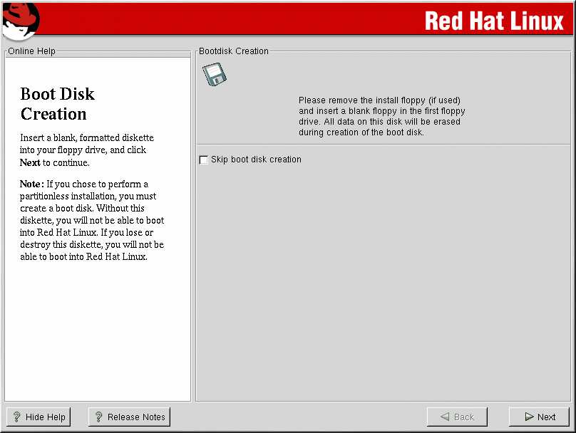 If you chose to perform a partitionless installation, you must create a boot disk. Without this diskette, you will not be able to boot into Red Hat Linux. If you lose or destroy this diskette, you will not be able to boot into Red Hat Linux. |