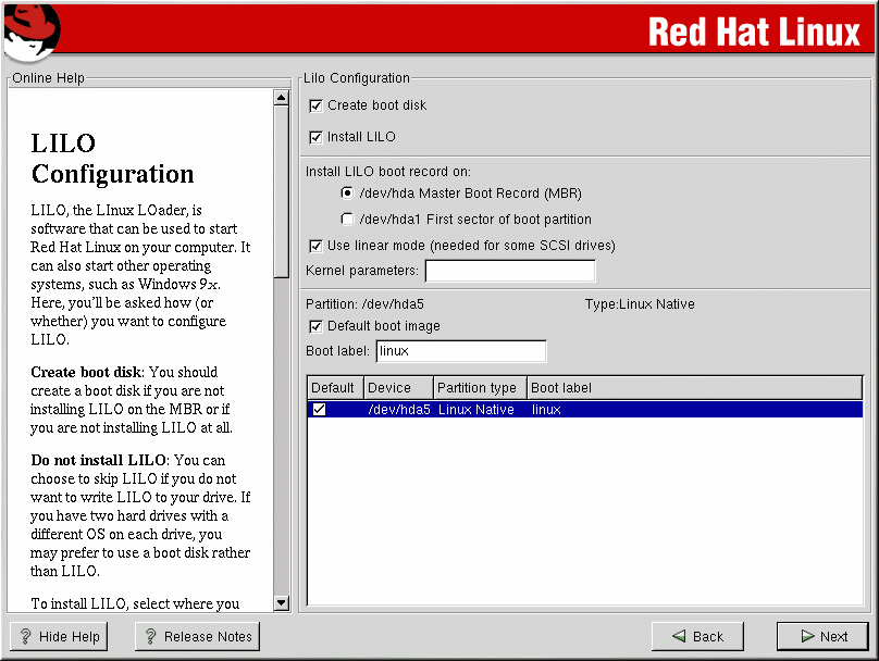 In order to boot your Red Hat Linux system, you usually need to install LILO (the LInux LOader). You may install LILO in one of two places: