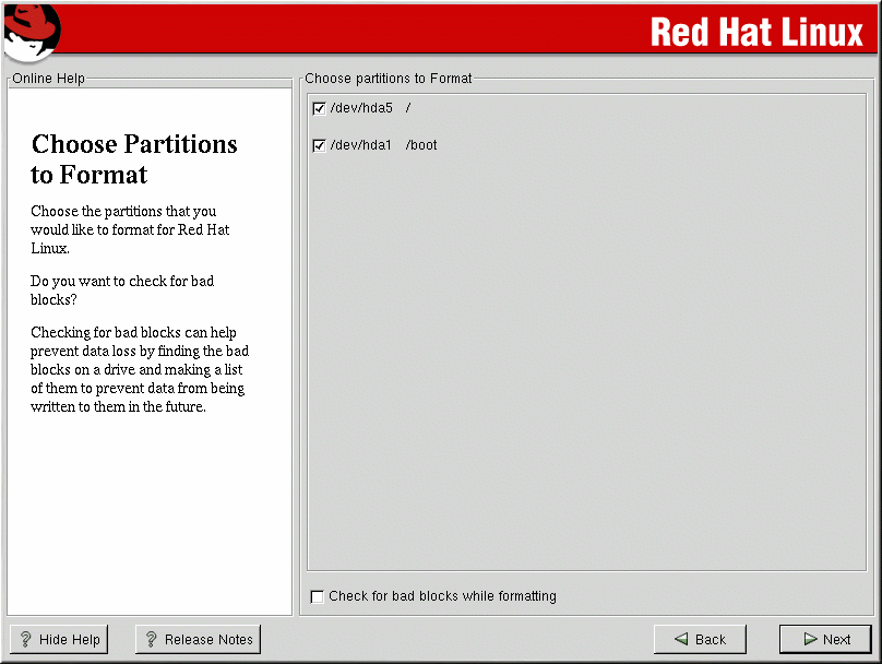 Selecting Check for bad blocks while formatting may dramatically increase your total installation time. Since most newer hard drives are quite large in size, checking for bad blocks may take a long time; the length of time depends on the size of your hard drive. If you choose to check for bad blocks, you can monitor your progress on virtual console #6. |