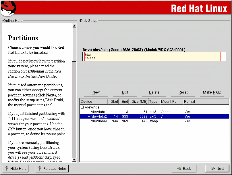 At this point, you must tell the installation program where to install Red Hat Linux. This is done by defining mount points for one or more disk partitions in which Red Hat Linux will be installed. You may also need to create and/or delete partitions at this time (refer to Figure 3-7).