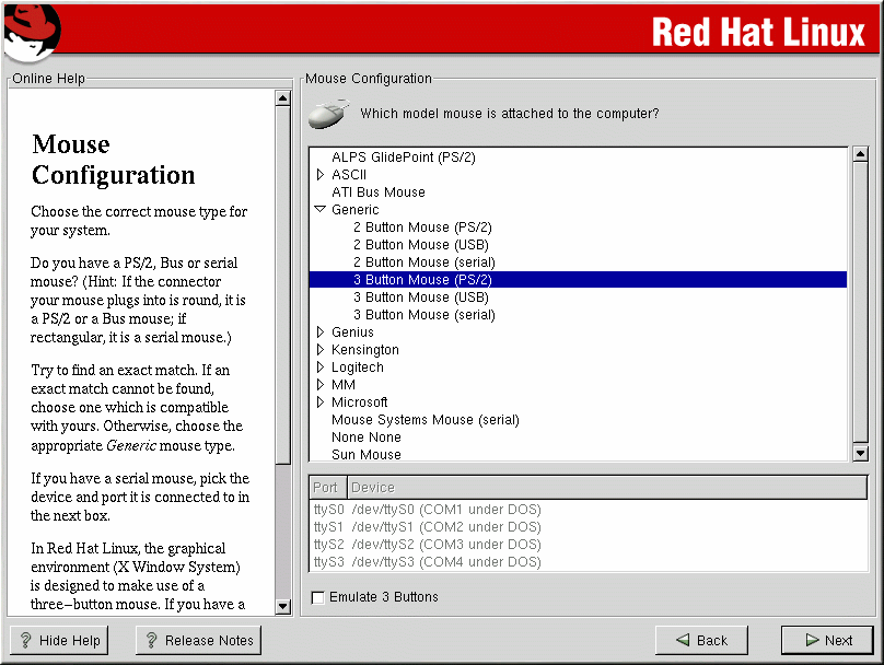 The Emulate 3 Buttons checkbox allows you to use a two-button mouse as if it had three buttons. In general, the X Window System is easier to use with a three-button mouse. If you select this checkbox, you can emulate a third, "middle" button by pressing both mouse buttons simultaneously.