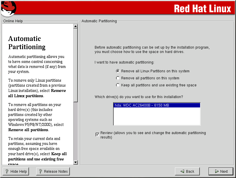 Remove all partitions on this system — select this option to remove all partitions on your hard drive(s) (this includes partitions created by other operating systems such as Windows 95/98/NT/2000).
