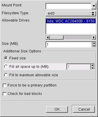 File System Type: Using the pull-down menu, select the appropriate file system type for this partition. For more information on file system types, see the Section called File System Types.
