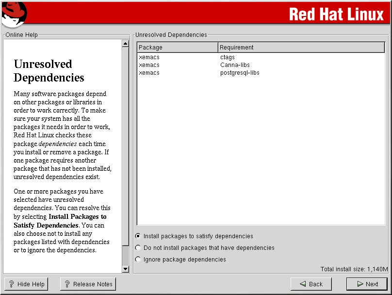 If any package requires another package which you have not selected to install, the program presents a list of these unresolved dependencies and gives you the opportunity to resolve them (see Figure 3-27).