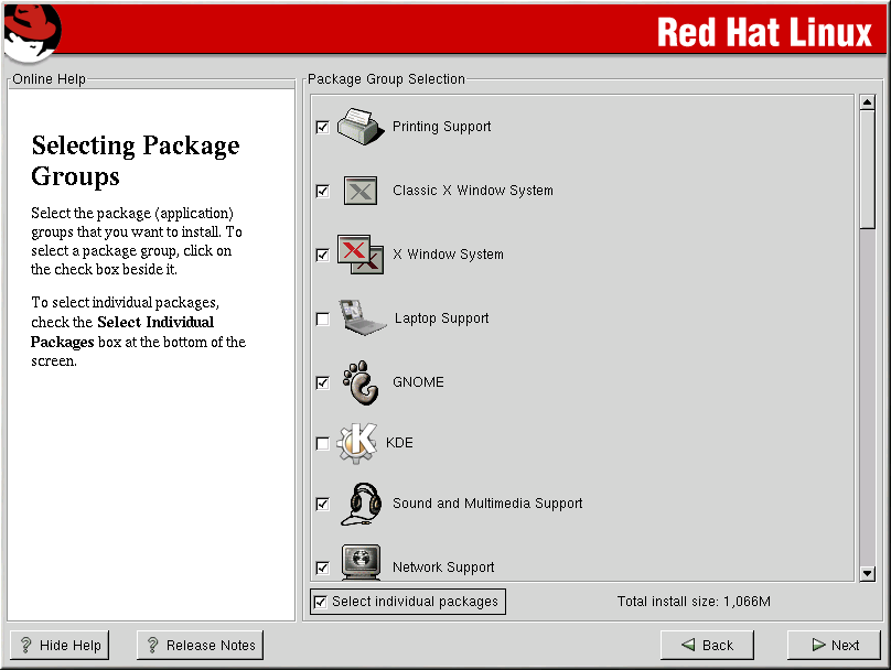 Some packages (such as the kernel and certain libraries) are required for every Red Hat Linux system and are not available to select or deselect. These base packages are selected by default. |