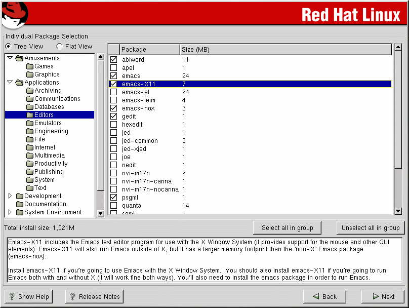 Using Tree view, you see a listing of package groups. When you expand this list (by double-clicking on the folder arrow beside a package group name) and pick one group, the list of packages in that group appears in the panel on the right. Flat view allows you to see all of the packages in an alphabetical listing on the right of the screen.