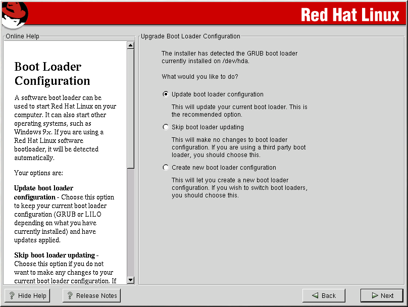 Create new boot loader configuration — Choose this option if you want to create a new boot loader for your system. If you currently have LILO and want to switch to GRUB, or if you have been using boot disks to boot your Red Hat Linux system and want to use a software boot loader such as GRUB or LILO, you will want to create a new boot loader configuration (see the Section called Creating a New Boot Loader Configuration for more information).