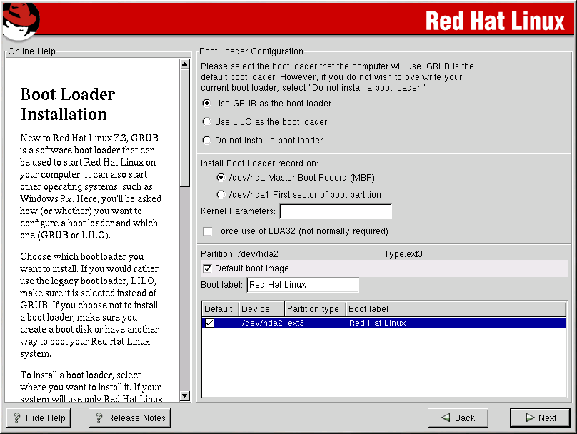 In order to be able to boot your Red Hat Linux system, you usually need to install a boot loader. In Red Hat Linux 7.3, you can choose to install GRUB or LILO, or you can choose not to install a boot loader at all.