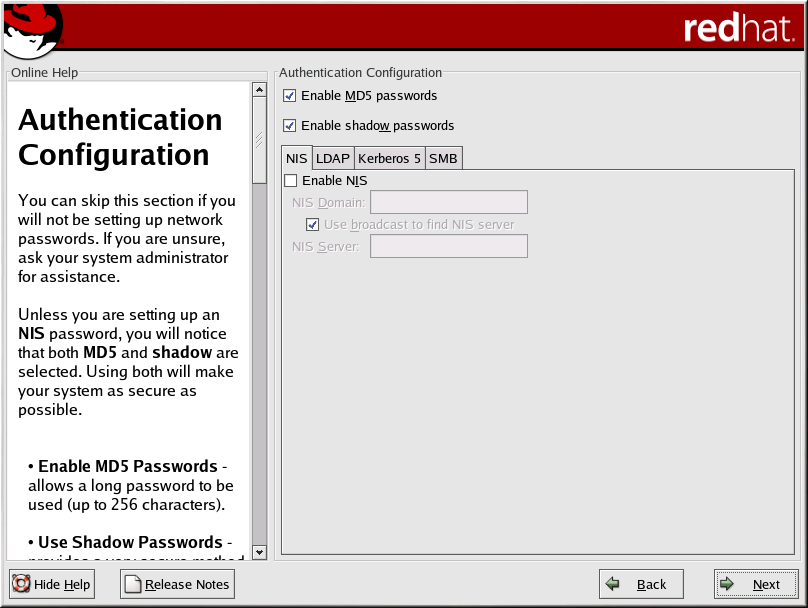 Enable Kerberos — Kerberos is a secure system for providing network authentication services. For more information about Kerberos, see Using Kerberos 5 on Red Hat Linux in the Official Red Hat Linux Reference Guide. There are three options to choose from here:
