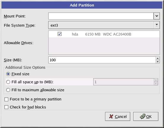 Size (Megs): Enter the size (in megabytes) of the partition. Note, this field starts with 100 MB; unless changed, only a 100 MB partition will be created.