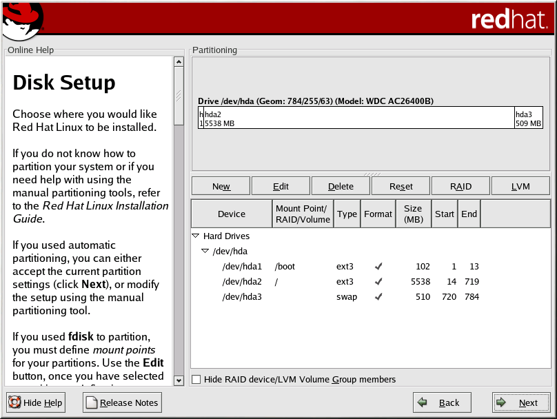RAID: Used to provide redundancy to any or all disk partitions. It should only be used if you have experience using RAID. To read more about RAID, refer to the Official Red Hat Linux Customization Guide.
