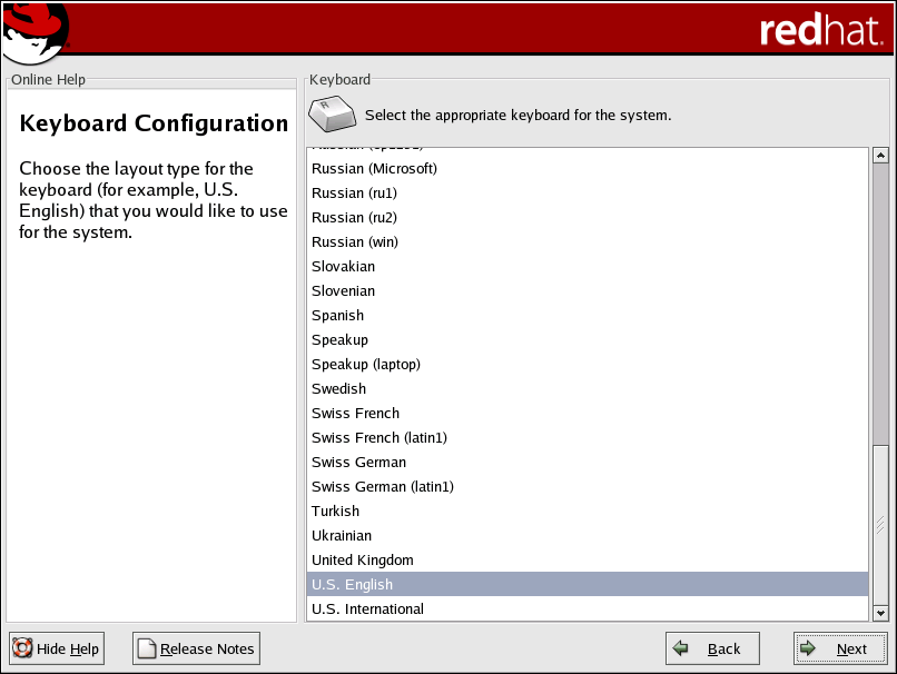 Using your mouse, select the correct layout type (for example, U.S. English) for the keyboard you would prefer to use for the installation and as the system default (see Figure 3-7).