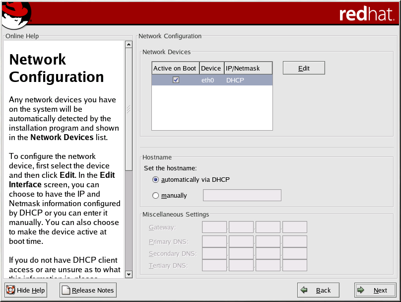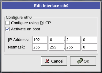 Once you have selected a network device, click Edit. From the Edit Interface pop-up screen, you can choose to configure the IP address and Netmask of the device via DHCP (or manually if DHCP is not selected) and you can choose to activate the device at boot time. If you select Activate on boot, your network interface will be started when you boot. If you do not have DHCP client access or you are unsure what to provide here, please contact your network administrator.