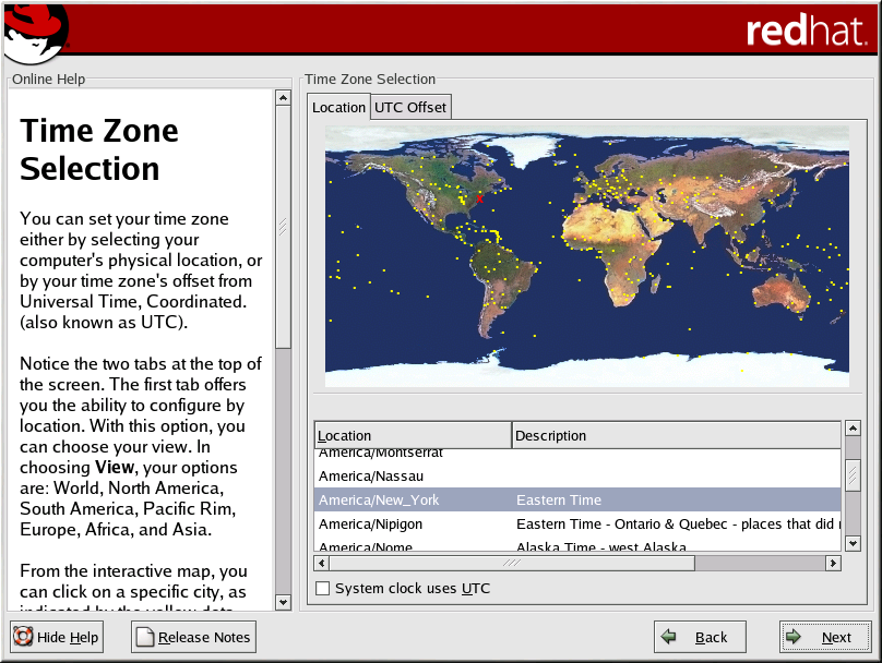 To change your time zone configuration after you have completed the installation, use the Time and Date Properties Tool. Type the redhat-config-date command in a shell prompt to launch the Time and Date Properties Tool. If you are not root, it will prompt you for the root password to continue. |