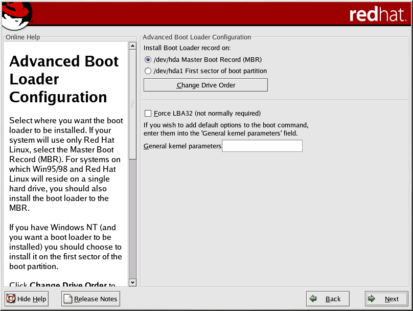 The Force LBA32 (not normally required) option allows you to exceed the 1024 cylinder limit for the /boot partition. If you have a system which supports the LBA32 extension for booting operating systems above the 1024 cylinder limit, and you want to place your /boot partition above cylinder 1024, you should select this option.