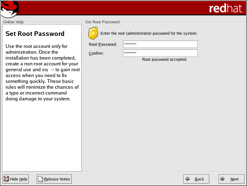 The root password must be at least six characters long; the password you type is not echoed to the screen. You must enter the password twice; if the two passwords do not match, the installation program will ask you to enter them again.