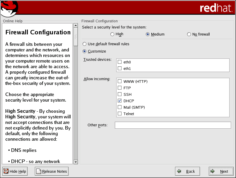 No firewall provides complete access to your system and does no security checking. Security checking is the disabling of access to certain services. This should only be selected if you are running on a trusted network (not the Internet) or plan to do more firewall configuration later.