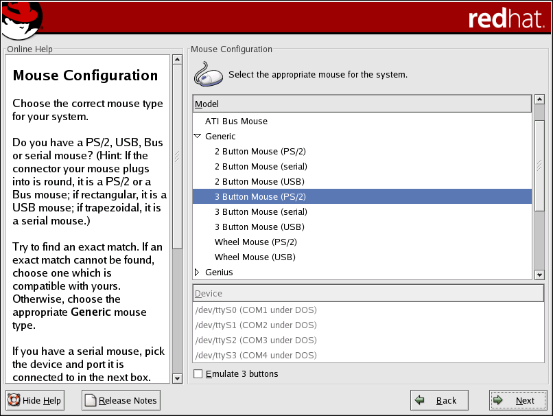 The Emulate 3 buttons checkbox allows you to use a two-button mouse as if it had three buttons. In general, the graphical interface (the X Window System) is easier to use with a three-button mouse. If you select this checkbox, you can emulate a third, "middle" button by pressing both mouse buttons simultaneously.