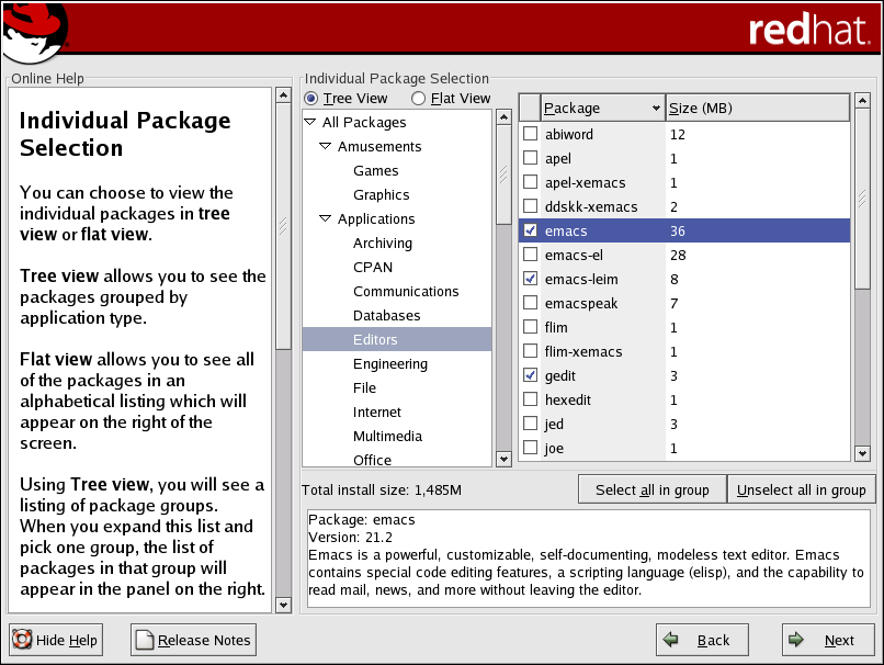 Using Tree View, you see a listing of package groups. When you expand this list (by double-clicking on the folder arrow beside a package group name) and pick one group, the list of packages in that group appears in the panel on the right. Flat View allows you to see all of the packages in an alphabetical listing on the right of the screen.